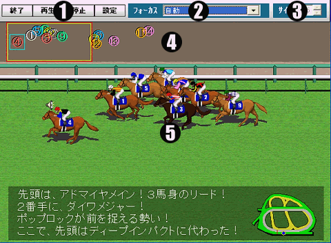 (1) 「停止」…レースを一時停止します。 「設定」VTR機能の設定を行います。 再生・停止は、画面上(4)(5)をクリックすることでも行えます。 レース開始(出走馬表示中)、VTR機能終了(レース結果表示中)の操作は、画面上(4)(5)をクリックすることでも行えます。全頭数の1/3以上がゴールした時点で、画面上(4)(5)をクリックするとレース結果の表示にスキップします。 (2) (3) (4) (5) 馬画像の上には以下のマークが表示されます。 設定「設定」 ボタンをクリックすると、設定ウインドウが開きます。終了確認を行う スタート前に出走馬名表を表示する 選択馬を初期フォーカスにする 馬名に馬番を追加して表示する ウエイト 注意点レースシミュレーションの経過・結果は、毎回少しずつ異なります。 VTR機能を使用するには、成績データが必要です。 障害レース、または初出走馬が多数いるレースなど、予想対象外のレースでは、シミュレーションを行うことができません。 VTR機能のレース内容は、実際のレースとは経過が異なる場合があります。 障害レース、19頭以上、または3頭以下のレースは、VTR機能を使用することができません。 コースデータは、2007年2月現在のものです。 ゴール板画像は、実際のものと異なる競馬場があります。 必要な画像ファイルが存在しないと、「ファイル ○○.bmp は開けません。」と表示されます。 |
