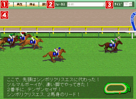 (3)ズームサイズを設定します。(直線は固定サイズ) (5)位置取り(直線では表示されません)、レース、実況メッセージ・コースが表示されます。 位置取りは、同レース出走馬が白枠、実況中の馬が水色枠で囲まれて表示されます。