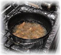| ケンタッキーフライドチキンのような味を目指してるけど、なかなか思うように行かない。しかし、外はカリッと中は ジューシーという食感はダッチオーブンならではであろう。 update:牛乳、卵白を追加。(H14.02.03) ◆調理 @まずは鶏肉を適当な大きさに切り分けます。骨付きのチューリップでもいいのですが、食べるところが少ないのでここで 鶏肉屋さんでケンタッキーフライドチキンで使っているような肉を入手。 ⇒おろしニンニクを肉にすり込む。 Aブラックペッパーと粗塩を振り掛ける。気持ち多めがお勧め。 この時に味を色々楽しむために、ブラックペッパー、カレー粉、ガラムマサダで少し辛くした鶏肉を準備。 B片栗粉をナイロン袋に入れて、その中に先ほどの鳥肉を入れてシェイクする。 Cダッチオーブンに油を準備する(2cmくらいがモリトさんのお勧めです) Dまずは肉を入れて10分、フタをしたままで揚げる。肉の量、油の温度などにより、その後は狐色になるまでフタをして繰り返 し確認しながらの作業になる。 後は揚がるのを待つばかり。揚げたての肉をそのまま食べるも良し、レモン汁を搾って食べるもよし ◆フライドポテト @メークイーンを縦半分に切り、それを▲切りに。(ロッテリアのポテトのイメージで) Aレンジで3分ほど調理。 B後はダッチオーブンに入れるだけ。 C揚げたての芋に塩を振って食べるだけ。 超簡単でめちゃ美味い! ◆こんちゃんのワンポイント! ・鶏肉への味付けは少し濃い目を意識して。 ・味のバリエーションを楽しむ。(ブラックペーッパー味、カレー味、辛味など) ・フライドポテトの芋はレンジで3分ほど事前に調理したほうが、柔らかく揚がる。 ・牛乳を入れるとカリッと揚がる。 |