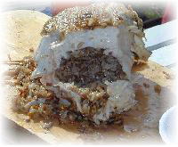 ◆調理 @まずは鳥肉の匂いけし。レモン汁を腹の中、および表面全体に塗る。このままで約30分は置いておく。 A鳥の腹に詰め物をいれる。通常は鳥の肝、ニンニク、たまねぎなど炒めたものを入れるらしいが、今回は冷凍 ソバメシをつめる。バジルを少少お腹にふりかけ、その後 お腹パンパンにソバメシを詰めて最後に竹串で中身が 出ないようにとめる。 B鳥に塩とブラックペッパーをぬる。油と共に流れ落ちるので、少少濃い目に振掛ける。その後、オリーブオイルを キッチンハケなどに含ませて、全体にぬる。 C下火で熱したDOに鳥を入れる。同時に月桂樹の葉を3〜4枚。バジルを少この時は鳥の背中が上を向くように。 ここで約60分程度、下火のみで焼く。 Dジャガイモ、ニンジンを隙間にいれる。この時に再度オリーブオイルを鳥の背中一面にぬる。 E今度は上火を使用して、鳥の背中部分を少し焦げ目が入る程度に焼き上げる。時間にして約30分。 後は焼きあがりを待つばかり。焼き上がったらそのまま食べるも良し、ワサビ醤油で食べるも良し・・・ ◆こんちゃんのワンポイント! ・上火を使用するタイミングでオリーブオイルを塗って、カリット照り焼き風の焦げ目をつける。 |