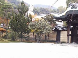北政所は天正16年(1588)従一位に叙せられ慶長8年 (1603)に後陽成天皇より高台院の号を賜り寛永元年( 1624)9月6日76才で亡くなった。 右の写真は高台寺の中庭(砂利が敷き詰められている) 瓦越しに大きな石像が。 |