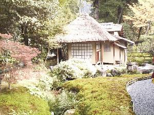 | 【高台寺】 東山霊山の山麓、八坂法観寺の東北にある。 正しくは 高台聖寿禅寺といい、豊臣秀吉没後 その菩提を弔うた めに秀吉夫人の北政所(ねね) が慶長10年(1605)に 開創した寺。 霊屋(おたまや)には北政所(ねね)のお骨が安地し てある。 右の写真は高台寺の境内にある遺芳庵(いほうあん) という茶席。 |