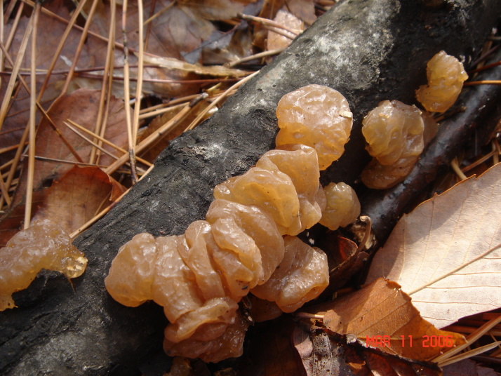 公園の朽ち木に生えていました。ゼラチン質で触るとぷよぷよしてます。 |