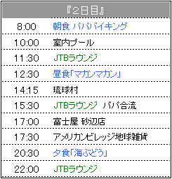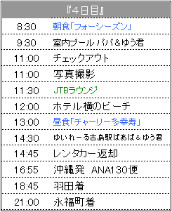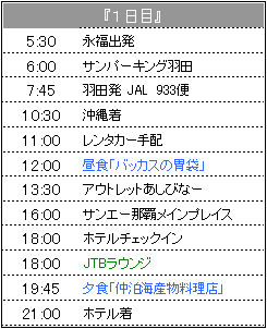 | 3月17日(木)晴れ <機内> 今回は4つの座席で行ったんだけど、パパだけが通路を挟んだ向こう側に座ったの。 眠いらしく ここからパパの爆睡タイム <(((~ρ~)))>グァーゴォーグァーゴォー・・・ ゆう君もひなも起きていて元気炸裂・・・ ε〜( ̄、 ̄;)ゞフー おまけにひなは大量ウンチをして あの狭い機内のトイレでオムツ換えするはめになるし 辛かったわ〜 でも、まぁ泣き叫んで迷惑かけるようなことはなかったから良かったのかな <ホテル> チェックインの時にいいものたくさんもらいました。 ・マリンスプラッシュチケット21 7000円分×3人分 パパのダイビング代に消えたわ・・・ ・温泉ヤマダの入浴券 家族で1枚だと男女一緒に行かないと行けないのがめんどうだよね ・朝食券(3回分)ランチにも使用できるんだよ♪ ・お子様ミールパスポート 指定レストランで子供のランチ&ディナーが無料になるチケット ・フリッパーズ 子供用のプレゼント(歯ブラシ・スポンジ・ぬりえ・クレヨン)が入ってます ・フリッパーズ手帳 スタンプラリーみたいなものでホテル内のお店を利用したりするとハンコを もらえて ハンコが溜まるとプレゼントがもらえます。 バッカスの胃袋:那覇市辻3-2-1 098-866-3288(エスパーナ2F) 海ぶどう:国頭郡恩納村南恩納6091 098-966-2588 |