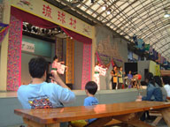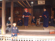 | おばあの島踊り 琉球村の目玉の1つだからたくさんの見物客が 集まってきてるんだけど ゆう君ったら真ん中に 座ってじっと見てるんだもん。 きっとみんなの写真に入っちゃってるわ。 もう〜っ 恥ずかしいんだから! |