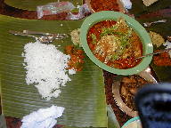 Banana Leaf Apolo( バナナ リーフ アポロ ) バナナの皮を皿代わりに食べる南インド料理。 右手でご飯とおかずを上手に混ぜて 食べるのが本場流だけど、観光客には フォークとナイフがちゃんと用意される。 店内は地元のインド人らしい人で わいわい にぎわっていた。 「すごく辛かったぁ」 |