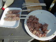 | いつもの「シシカバブー」 豚挽き肉 に しそ を混ぜて割り箸に 付けて焼きます。 |