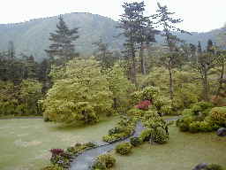 温泉! ここも混雑していた。 びっくりしたのが、受付をしてロッカーで浴衣に着替えて渡り廊下をあるいて風呂まで行くシステム。ちょっと面倒だった・・・ 温泉は露天風呂が思ったより小さかったが きれいで気持ちが良かった。 風呂上りは庭に出て散歩・・・と思ったが 雨だったので、眺めるだけに終わった。 |