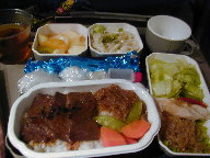 | 第1ターミナルは改装されてとても 綺麗になってました。 | 8時間近いフライトでの唯一の楽しみは機内食!メニューはビーフかウナギでした。我々はビーフを選択。中身はすき焼き丼でした。美味しかった。 |
