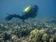| ダイビング 8:30にホテル前でショップの車にピックアップしてもらいました。ショップはラハイナにあります。 ファンダイブは3人、体験ダイブは6人くらい居たのかな。 ポイントは偶然ホテルのすぐ近く。ハイアットの前のビーチはサンゴも死んでいて、魚も居なかったのにここはとても綺麗です。 水中から水面を見上げるとシュノーケリングしている人が見えます。明日にでも奥さんを連れてきてあげよう。 |