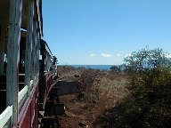 ポー という汽笛を鳴らして機関車が駅に入ってきました。 | 車窓から見える景色は砂糖キビ畑やゴルフ場、それにマウイの青い海です。 |