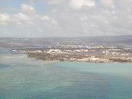 空から見たホノルル空港。空港の近くの海もエメラルドグリーン。 |