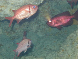 | 真っ暗な岩の間をライトで照らしてみると・・・ アカマツカサがいっぱい。 ちょっと不気味だった。 |