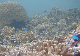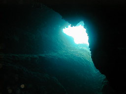 『サンゴホール』と呼ばれているのは 真っ暗なトンネルと抜けると、 そこに一面のサンゴが広がっていたからだそうだ。 そう、残念ながら数年前のサンゴの白化現象で 悲しい景色になってました。 でも、またいつの日かきっと 元気なサンゴが戻ることを祈りつつ・・・。 |