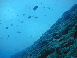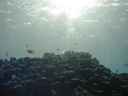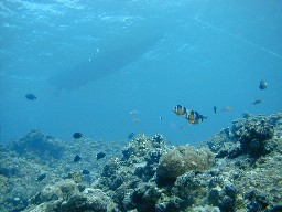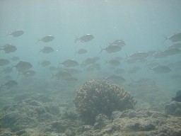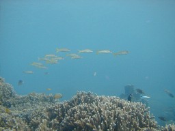 | 2本目は伊良部島にはまった 理由でもある 『中ノ島ビーチ』へ。 ビーチから潜行してすぐ。水深も3Mくらいかな。 いきなり目の前をカスミアジの群れが縦断! やっぱり『中ノ島ビーチ』はあなどれない・・・。 |