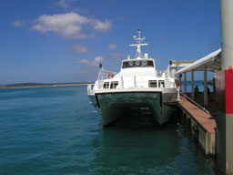 | 宮古島空港から平良港へはタクシー移動。 平良港から伊良部島へは高速船で15分(400円) 向こうに見えるのが伊良部島。 |