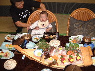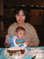 夕飯はコース料理だよ。 始めはベビーカーに大人しくしてたけど 「僕も仲間に入れてぇ〜」ってぐずぐず ママのおひざの上で仲間入りしました。 |