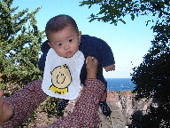 海を飛ぶゆう君 抱っこひもも結構疲れるから抱っこで観光。 こっちの方が楽かも。 |