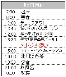 | 11月4日(日)晴れ のんびりチェックアウトをして『さぁ観光だぁ!』 今回の旅の目的のひとつ【ゆう君に海を見せてあげる】だったから天気が良くて よかったぁ〜すごく嬉しい!天気予報外れてバンザーイ。 色々観光してもゆう君がぐずぐずしないから楽しかったぁ オムツ換えも授乳も車の中ですませて、快適な観光だったよ。 ホントはテディーベアをばあばはゆう君に買いたかったみたいだけど、赤ちゃんの 頃はあまりぬいぐるみを持たない方がいいって言うから断っちゃった。 大きくなったら買ってもらおうね。くま好きなゆう君に可愛いくまさんを たくさん見せたからママは大満足だよ。ゆう君はどうかな? 宿泊先の北川温泉ホテルは由緒あるホテルって感じ。ゆう君のお風呂は 部屋のお風呂を沸かして入れました。その蛇口からも温泉が出てるので ゆう君ホカホカになっちゃった。よかったね。夕食時間にゆう君オネンネだったから ゆっくり食べれたよ。ありがとうゆう君。 |