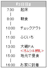 ☆★ 旅行が終わって ★☆ 生後4ヶ月のゆう君のはじめての旅行。どうなることか と心配していたけど、すごく順調で楽しく過ごせた。 帰ってきたらゆう君の風邪は随分良くなっていたので ほっと一安心。 持ち物もばっちりだったし、天気もばっちり!(さすが晴れ女の私の子) この調子ならどんどんいろんな所にゆう君を連れてってあげたいなぁ〜。今度の旅行はどこにしようかなっ(笑) |