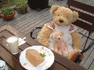 ティールームにて 紅茶のシフォンケーキとバナナジュース テーブルにテディが座ってお出迎えしてくれるの。 めちゃくちゃ可愛いよ〜っ! ケーキの味の方も(^^)d グッド! |