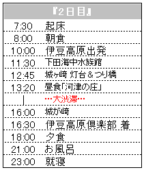 ☆★ 旅行にあたって ★☆ 旅行って言ったって 年に3回は行く伊豆高原への旅。 ゆう君がもう9ヶ月だし 特に 気合入れて用意もしなかったなぁ〜・・・(車だから全部積め込め〜って感じだし) ただ 2泊3日の 中日にパパさんがダイビングをしちゃうから 「その日はどこに行こうかなぁ」って悩んだくらいだわ。 修善寺にある『虹の郷』か下田にある『下田海中水族館』どっちにしようかな って感じで まぁ〜 その日の天候もあるし、2日目の朝にでも考えよ〜って事で のんびりかまえてましたよ。 今回の旅行は、2週間後に沖縄旅行が控えてるから無理をしないように を念頭において ・・・ ゆう君・パパ・ママ・ばあばの4人で |