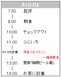 ☆★ 旅行が終わって ★☆ 今回ほどカーナビさんが素晴らしいって思ったことはないわ! それはなんでかって言うと・・・ 翌日 会社に行ったら 同じ時間に 同じ伊豆高原倶楽部から東京に帰ってきた上司が 大渋滞にはまって 帰ってきたのが19時だったらしいの。我が家の帰宅時間と3時間も差があるのよ〜っ しかも うちは「箱根ビール蔵」で1時間も待たされてるから もしかしたら4時間くらい差があったかも!? たま〜に カーナビに裏切られる事もあるけど、信じて見るのもいいかなって見なおしちゃったわ。(笑) みんな〜っ 家の車についておいでよ〜 (な〜んちゃって) |
