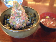 <伊豆の味処 錦>★公式サイト 前回に行った時、隣の人が美味しそうな『鯵のたたき丼』を食べていて それを注文しなかったのを 心残りにしたパパのリベンジで寄りました。 相変わらずすごい量・・・しかも 新鮮で美味しいからたまんないの。(○`〜´○)モグモグ ママは『磯納豆丼』にして ゆう君に取り分けてあげたんだけど、ゆう君も 納豆大好き息子なだけあって 嬉しそうに食べてたわ。 ここは人気店だからOPENと同時に行くのがポイント! 12時くらいに行っちゃうと結構待つかもねぇ〜 |