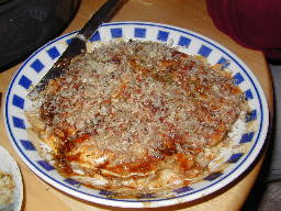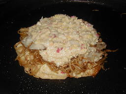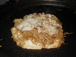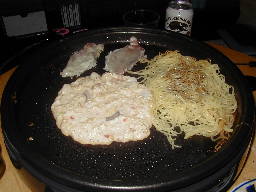 | 生地の縁が透明になってきたら、そばを載せて肉をその上に載せます。 肉については細かく切って生地の中に混ぜるのが正しいという頑固な友人も居ますが、そばと肉がカリッとしたのがいいと思います。 |
