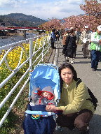 大きな桜の木の下で すごく綺麗なのよ〜っ☆ でも、ベビーカーのゆう君との写真は ちょっと難しいなぁ・・・ |