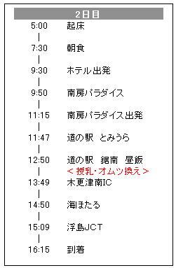 | 1月23日(火)曇時々晴れ 出発はのんびりとスタート。ママは久しぶりの長距離運転なので、ちょっと 緊張気味・・・昔はスノボーとか自分で運転して行ってたのになぁ〜っ ドキドキしながらも 首都高速に乗ったらあっという間に『海ほたる』に到着! 海ほたるは すごく良い景色♪晴れてて良かったぁ〜っ お土産屋さんを見たり、ご飯食べたりで2時間近くもいちゃった。(笑) 早く行かなきゃっ 暗くなったら大変だぁ!! 白浜は下道がとにかく長い〜〜〜〜っえんえん2時間かけてつきました。 途中 ゆう君はず〜っと寝てたので 気分的には楽だったなぁ〜 ホテルに着いたら レストランに人だかりが!何かと思って聞いてみたら ロンドンブーツと大澄けんやが撮影に来てるとの事。もちろんミーハ―親子 は撮影が終わって出てくるのを待ちましたよ。待って りょう君と記念撮影! ゆう君が大きくなるまで 売れてたらいいなぁ〜 撮影の影響で夕飯の支度が遅れたとあって、ホテル側から飲み物サービス がありました。ロンブーには会えるし、ビールは無料 とてもラッキーだわ♪ 食後は大浴場へ...ゆう君はじめての大浴場。脱衣所にはベットがあって 脱ぎ着が楽でした。大きなお風呂も ゆう君はびびらず 気持ち良さそうに 入ってたよ。お風呂が気持ち良かったせいか夜はみんなぐっすり眠れました。 |