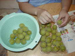 準備 実を傷つけないように竹串でへたをとる。 (我が家には竹串が無いので、楊枝で代用) ↓ 流水でよく洗って汚れをおとす ↓ 1個ずつ丁寧に水をふきとる (水が残っているとカビの原因に・・・) |