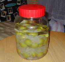 ホワイトリカーを注ぎ入れて 出・来・あ・が・り! 冷暗所に保存 (ちなみに我が家は流し台の下です) あとは時々様子をみて瓶をゆする (砂糖が下に沈むので糖分を均等にする) |