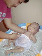 週末はパパが悠洋くんの沐浴担当。パパの大きな手に包まれて気持ち良さそう〜〜