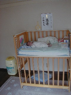 母子同室なので、ママと一緒に寝ています。
