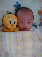最近は おしゃべりする時間が多くなってきた。おしゃべりって言っても 「ア〜」「ウ〜」の世界だけど・・・早く 「ママ!」 って言ってくれないかなぁ (赤ちゃんの「ア〜」「ウ〜」の言葉を:喃語という) ♪ 赤ちゃん情報 ♪ 沐浴後に綿棒でやってあげるだけでは 直らない頑固な鼻詰まりには 産科のお医者さんに聞いた鼻詰まり解消方法を試してみて下さいねぇ〜 1)沐浴後に、ティッシュで”糸こより”を作って 鼻へ・・・コショ コショってする。 2)タオルを少し熱めの湯でぬらして 鼻の穴のそばへもっていく(やけどに注意) |