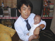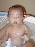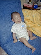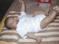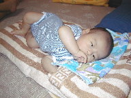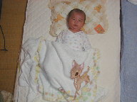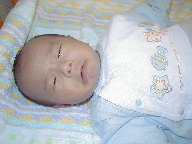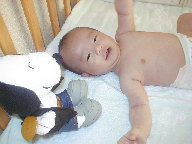 おっぱいおねだり中のゆう君。 とっても悲しい顔するので、思わず写真を撮ってしまいました。(ゴメンネ・・・ゆう君) 最近は、ゲップがとても上手になって 大きな「ゲッ」の音に パパもママもゆう君も びっくりするくらいです。 上唇に出来ていた”おっぱい吸いダコ”も一皮向けてきれいになりました。 おしゃべりにレパートリーが増えました。「ニャ〜オン」なぜか猫の鳴きまねを・・・ |