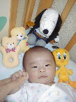 「ばっちりカメラ目線」のゆう君 ちょっと前までは カメラがイヤで笑顔が消えていたけど、最近は慣れたのか すっかりカメラ目線に・・・(ママのBaby時代は全部カメラ目線なんだよ) でも、この1ヶ月ですごく進歩したなぁ〜 どんどん変わっていくよ。顔も行動も言動も・・・そして体形も・・・ 今のお気に入りはパパがやってくれる「♪げんこつ山のたぬきさん〜」 |