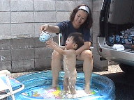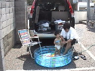 | 2001/07/10 | お家でプール めっちゃ暑いからビニールプールで遊んでみた。 準備は簡単!パパが買ってきてくれたエアポンプでプシューって空気を入れて 洗車用のシャワーホースを使って水をためればできあがり♪ 水も10pくらいしかためないから あっという間に家庭用プールができちゃうんだぁ。 パラソルを出すのが面倒だったから車の後部ドアを開けて日よけにして 大人用にイスを2脚だしてみた。ママ&ばあばは足を入れてるだけでも快適だったよ。 ゆう君は、水でっぽうを持って ちょっと遊んでたけど、お尻をついては遊ばなかったんだ。 ( ̄へ ̄|||) ウーム・・・ 機嫌が悪かったのかしら? ビニールボールとかおもちゃを入れてあげたんだけど、気に入らなかった様子・・・ ビニールプールを買うときに あんまり大きいとスペースを取りすぎるから100pのを 買ったんだけど、これじゃ小さかった。お友達も招待してプール大会をしたかったが せいぜい2人がいいところかなぁ〜・・・ あーんもっと大きいの買えば良かったよ。 来年は ゆう君も大きくなるだろうから買い換えちゃおうっと (@⌒ο⌒@)b ウフッ 最近のゆう君はね、困ったことを2つするの。 1・鼻の穴に指を入れる。 自分の顔に穴があるって気がついたみたいで、凹凸フェチのゆう君は鼻の穴が 遊び道具だと思っちゃったみたい。 鼻の穴に指を入れて 嬉しそうにニヤッって笑うから その顔が・・・まぬけっぽくて可愛くて(笑) 2・噛みまくる 歯が一気に生えてきてるからかゆいのか 噛むのよ〜っ ☆ ̄(>。☆)イテェ それが本当に痛いの。ママは体にあざが何個もできてしまった。 一生懸命 注意してるんだけど 伝わらなくてねぇ・・・┐( ̄ヘ ̄)┌ フゥゥ〜 お友達にやっちゃわないか心配だわ。 早くこの2つをやめてくれないかなぁ〜 (○ `人´ ○) タノンマスー! |
