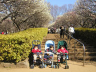 | 2/21 | 梅まつり とっても天気がいいので お友達と羽根木公園の梅まつりに行ってきた。 ここは妊婦時代に梅まつりに来たことがあったけど、傾斜があって土ホコリがすごい印象・・・ その印象は正しかった・・・。まつりの会場はベビーカー族にはチトつらい傾斜でした。 レジャーシートを広げてお弁当を食べたんだけど、ママは梅見に合わせてお花のお弁当を 作ったのに ゆう君ったら全然興味なし・・・( ̄▽ ̄;)!!ガーン かなしいわ〜 子供心をくすぐる弁当を考えたんだけどなぁ〜 結局 おかずのコーン&はんぺんのバター焼きでお腹一杯にしちゃったの。あーあー・・・ 食べた後は 子供たちを遊具の広場で解放! 思いっきり楽しそうに遊んでたわ。 羽根木公園の遊具はちょっと古い感じの遊具がたくさんってかんじだったなぁ〜 帰りは 羽根木公園から足を延ばして明大前まで歩いてしまった。 だってぇ〜 東松原駅って階段が多くてベビーカー族には辛い駅なんだもん。 思ったより近かったから来年もこのコースで行っちゃうかもね♪ |