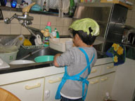 お手伝い 最近、ゆう君のブームは『お手伝い』 毎日せっせっとお手伝いをしてくれてるんだけど、中でもお気に入りは台所仕事みたいなの。 誰かが台所に立つと「よ〜し!」と言いながら 腕まくりをしてエプロンをして踏み台を持って来る。 まぁ〜ただ水遊びがしたいだけなんだけど、「お手伝い♪」って言いながら上機嫌なの。 ゆう君の担当は イチゴとか洗ったり、卵の殻むき(卵サラダ用の)、調味料探し 、食器洗い。 本人はいたって真剣にやってるけど 失敗も多い・・・。 だから最近の我が家の台所は笑いが耐えないのよねぇ〜 (^^) 写真のエプロン姿 正面から撮りたかったんだけど ゆう君は台所仕事に集中してて こっち向いてくれなかったの。頭にキャベツの葉を乗せられてもしばらく気がつかないんだよ。(笑) このエプロン親子お揃いだからいつかふたりで記念撮影したいなぁ〜♪ |
